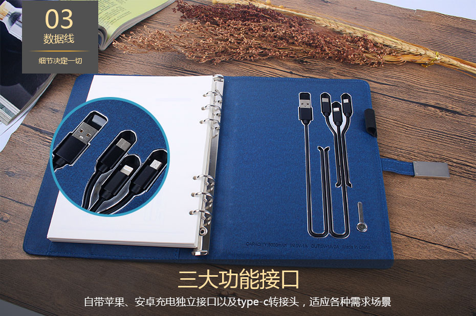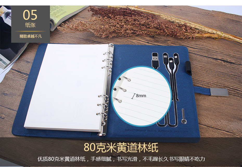 ◆ 4000毫安/6000毫安/8000毫安充電寶U盤充電記事本,可以同時為兩款數碼產品充電; ◆ 內置收納功能,可放置各類票據、證件、銀行卡等; ◆ 筆袋設計放置簽字筆,寫作便捷